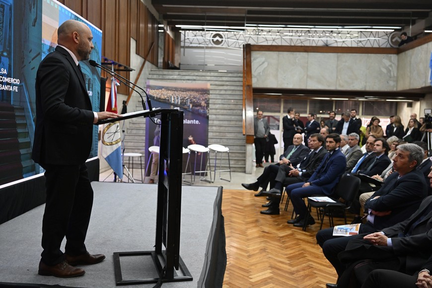 Puccini acompañó a Pullaro en la reunión donde las Bolsas de Comercio de Santa Fe y de Rosario presentaron el indicador económico. Crédito: Juan Manuel Foglia