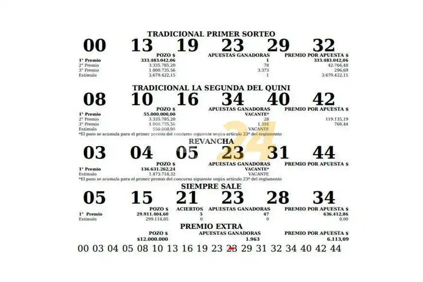 El apostador se quedó con la categoría “Tradicional” y se llevó un premio de $333.483.042,06. A su vez, el agenciero vendedor del ticket se llevó un estímulo de más de $3.000.000.