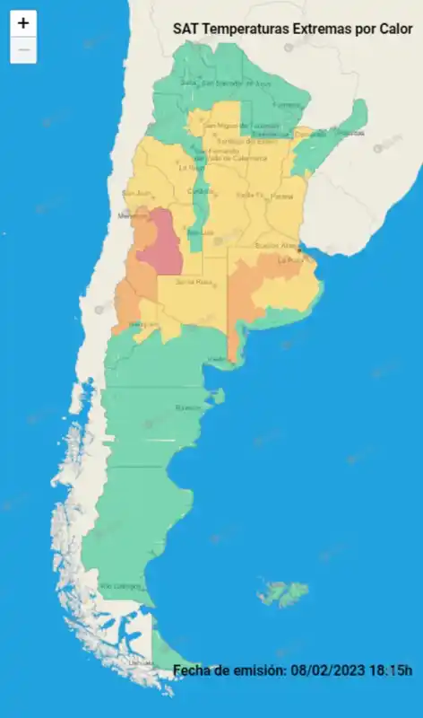 Así lo informó en su última actualización el Servicio Meteorológico Nacional, advirtiendo que en algunas provincias las temperaturas máximas llegarían a un alerta rojo, como en Mendoza, o naranja como la zona cordillerana de esa provincia cuyana, Neuquén y parte del territorio bonaerense.