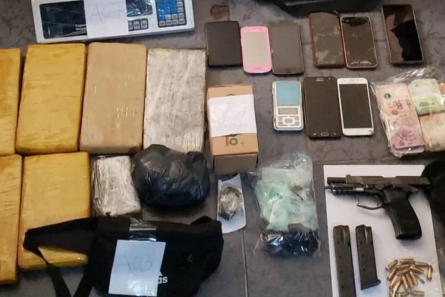 Los agentes hallaron en una habitación siete paquetes encintados con cinta de embalar y nylon de cannabis, además un arma de fuego calibre 9mm marca Bersa con número suprimido municionada con cargador largo colocado, un cargador de 9mm vacío y 23 municiones intactas, 2 municiones calibre .22 intactas, 7 celulares, un disco externo, dinero en efectivo, una balanza precisión, una balanza digital y una motocicleta 110cc marca Keller con pedido de captura activo con fecha reciente por robo calificado.
