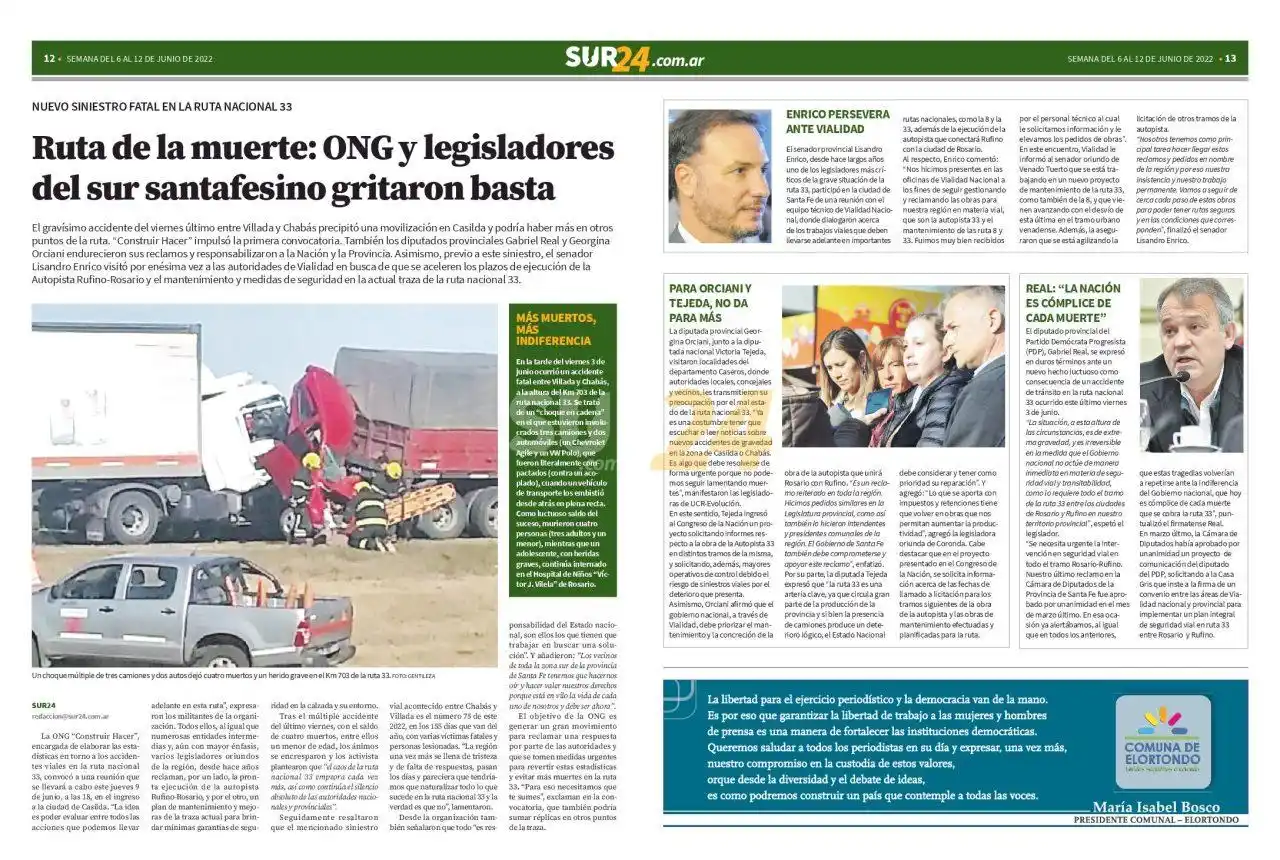 Seguidamente resaltaron que el mencionado siniestro vial acontecido entre Chabás y Villada es el número 75 de este 2022, en los 155 días que van del año, con varias víctimas fatales y personas lesionadas. “La región una vez más se llena de tristeza y de falta de respuestas, pasan los días y pareciera que tendríamos que naturalizar todo lo que sucede en la ruta nacional 33 y la verdad es que no”, lamentaron.