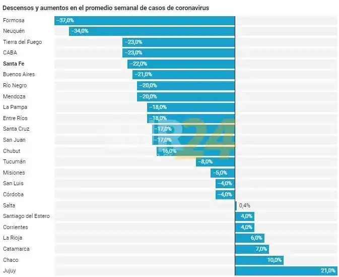 Por el otro lado, las siete provincias que registraron un aumento en el promedio de nuevos casos diarios son: Salta (+0,4%), Santiago del Estero (+4%), Corrientes (+4%), La Rioja (+6%), Catamarca (+7%), Chaco (+10%) y Jujuy (+21%).