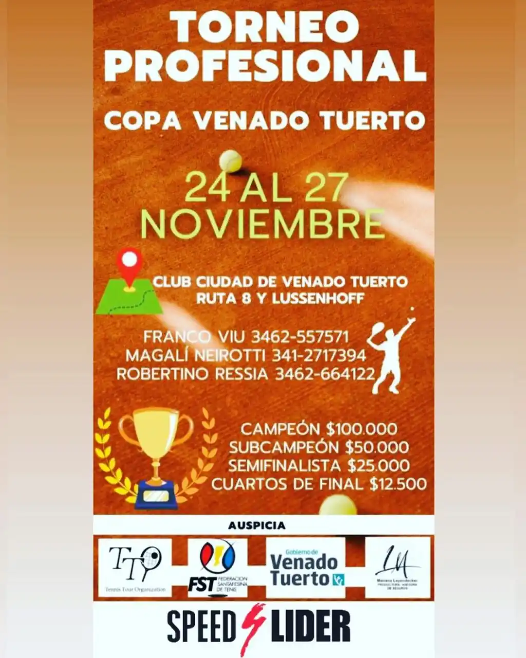 Organizan Franco Viu, Robertino Ressia, Magalí Neirotti, con el auspicio del Gobierno de Venado Tuerto, Tennis Tour Organizations, Federación Santafesina de Tenis, Mariana Leyendeckey (Productora Asesora de Seguros), Speed Lider, Revell Plast, Casa Nueva Hogar, Laboratorio LAX de Rosario, Farmacia Petri, Estudio Jurídico Codina y Assandri, Delicatessen, Verdulería “El Pity” y Pampero Chico Frigorífico.