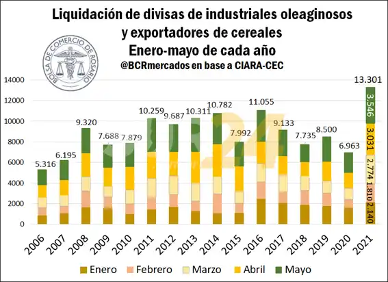 Los primeros cinco meses del año se alcanzaron liquidaciones de divisas por más de 13.300 millones de dólares y el período enero-mayo 2021 se consolidó como el de mayor liquidación de divisas de la historia, según surge de datos informados por CIARA-CEC. Un panorama de precios muy favorecedor, acompañado de un leve repunte de los niveles de exportación del complejo soja, fueron de la partida para consolidar este ingreso de divisas.
