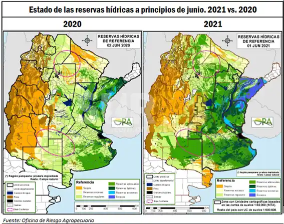 Hay algo que distingue a esta campaña de la anterior, y es que, al menos al puntapié inicial de las siembras, las condiciones se presentan prácticamente como inmejorables. Tal como se puede observar en la imagen que sigue, el estado de las reservas hídricas es de adecuado a óptimo en la mayor parte de las regiones productivas de nuestro país, con sólo algunas regiones puntuales presentando excesos y otras reservas regulares.
