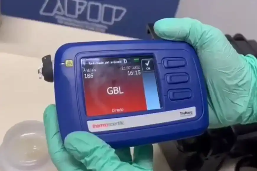 Cuando el envío estaba por ser retirado, las autoridades procedieron a la apertura de la caja y visualizaron dos frascos de removedores de pintura transparentes, similares a un gel líquido, que fueron sometidos al analizador portátil de sustancia TruNarc, arrojando resultado positivo de la sustancia GBL.