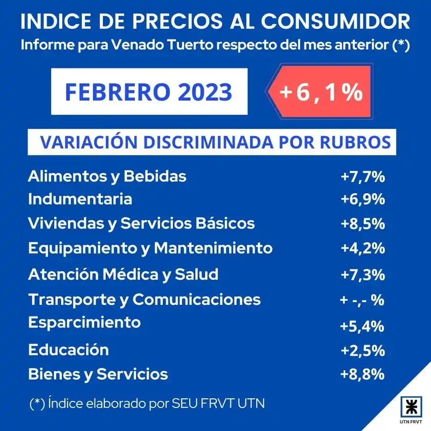 En las últimas horas, la Universidad Tecnológica Nacional (UTN) – Facultad Regional Venado Tuerto, dio a conocer el resultado del informe que realizan mensualmente para conocer el índice de precios al consumidor en el sur-sur santafesino. Según indicaron, la inflación en el mes de febrero de 2023 fue del 6,1% y la variación interanual alcanzó el 102,1%.