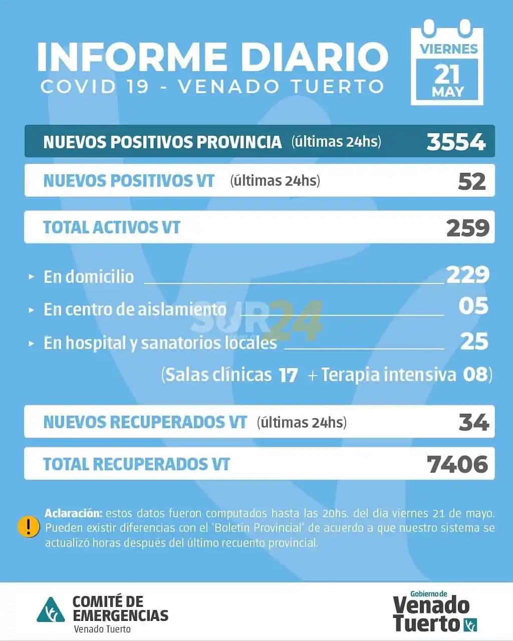 El informe del Municipio y el COE local también arroja que de estos 252 activos, 229 se encuentran aislados en sus domicilios, cinco están alojados en el Centro de Aislamiento municipal y los venadenses que requieren internación son 25: ocho en sala UTI y 17 en sala clínica, repartidos entre el Hospital y los efectores privados de la localidad.