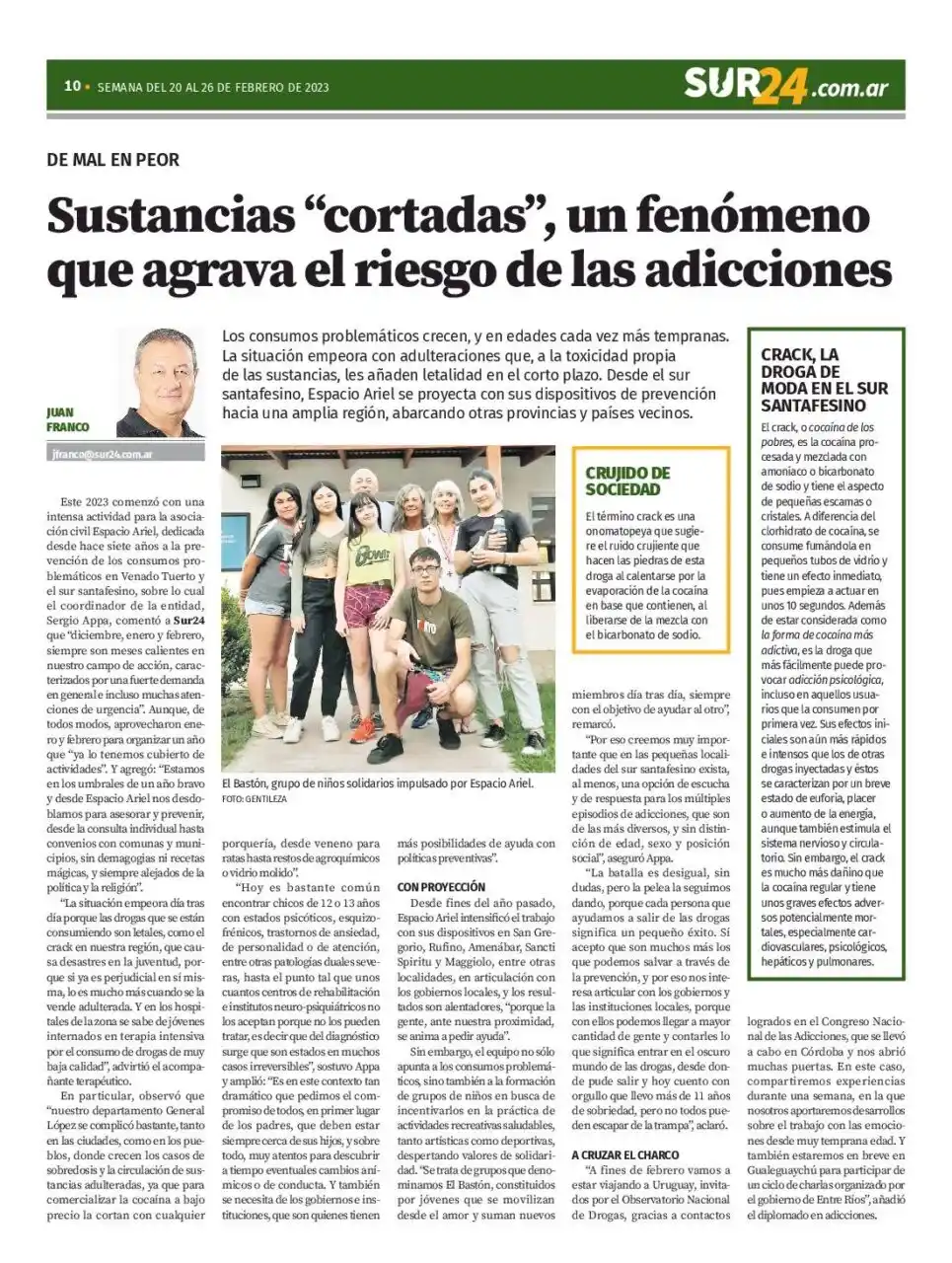Este 2023 comenzó con una intensa actividad para la asociación civil Espacio Ariel, dedicada desde hace siete años a la prevención de los consumos problemáticos en Venado Tuerto y el sur santafesino, sobre lo cual el coordinador de la entidad, Sergio Appa, comentó a Sur24 que “diciembre, enero y febrero, siempre son meses calientes en nuestro campo de acción, caracterizados por una fuerte demanda en general e incluso muchas atenciones de urgencia”. Aunque, de todos modos, aprovecharon enero y febrero para organizar un año que “ya lo tenemos cubierto de actividades”. Y agregó: “Estamos en los umbrales de un año bravo y desde Espacio Ariel nos desdoblamos para asesorar y prevenir, desde la consulta individual hasta convenios con comunas y municipios, sin demagogias ni recetas mágicas, y siempre alejados de la política y la religión”.