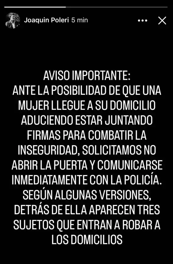 Lo hizo a través de su Facebook, donde señaló que “ante la posibilidad de que una mujer llegue a su domicilio aduciendo estar juntando firmas para combatir la inseguridad, solicitamos no abrir la puerta y comunicarse inmediatamente con la Policía”.