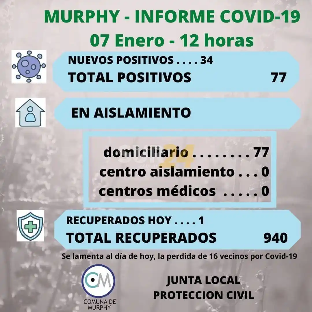 Este viernes se detectaron 34 nuevos pacientes positivos, informan, y un paciente recibió el alta médica, lo que deja un total de 77 casos activos.