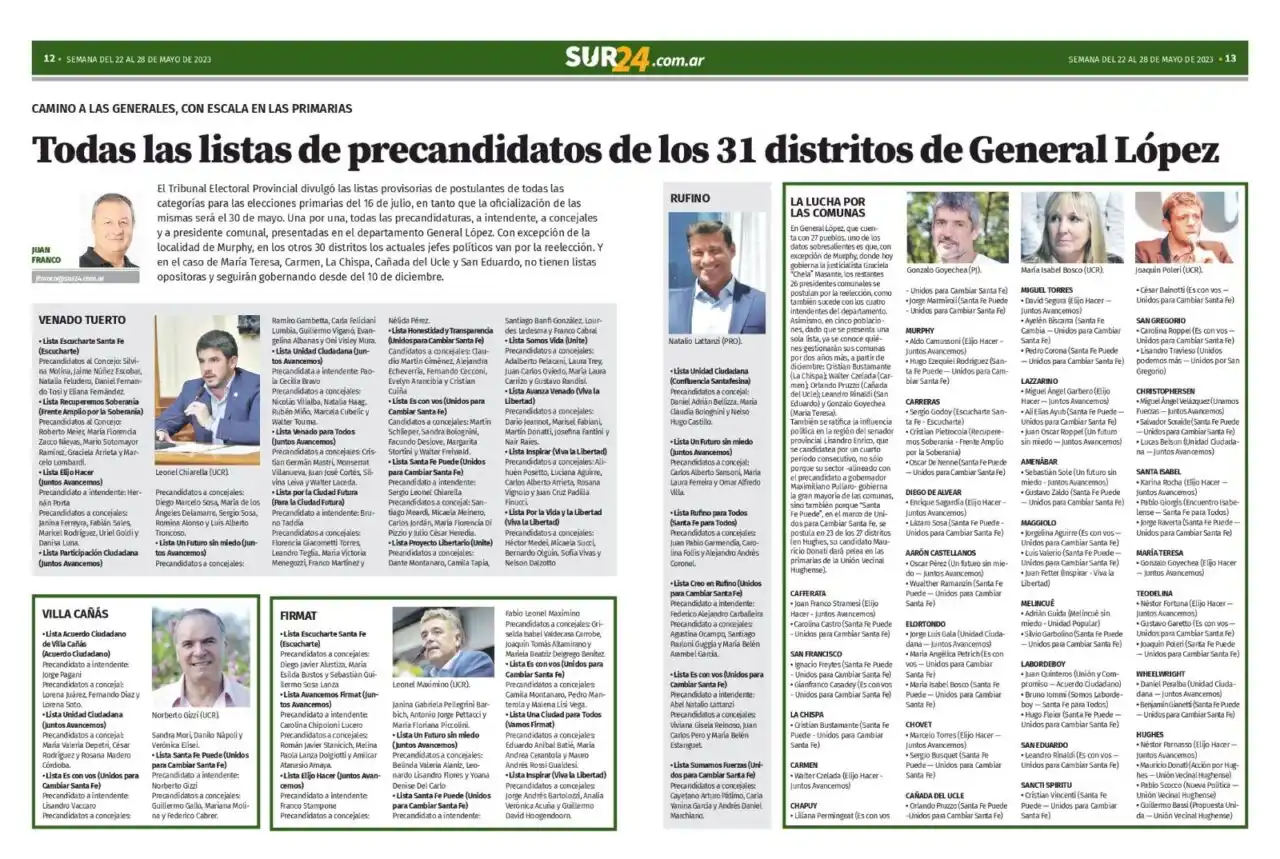 También se ratifica la influencia política en la región del senador provincial Lisandro Enrico, que se candidatea por un cuarto período consecutivo, no sólo porque su sector -alineado con el precandidato a gobernador Maximiliano Pullaro- gobierna la gran mayoría de las comunas, sino también porque “Santa Fe Puede”, en el marco de Unidos para Cambiar Santa Fe, se postula en 23 de los 27 distritos (en Hughes, su candidato Mauricio Donati dará pelea en las primarias de la Unión Vecinal Hughense).
