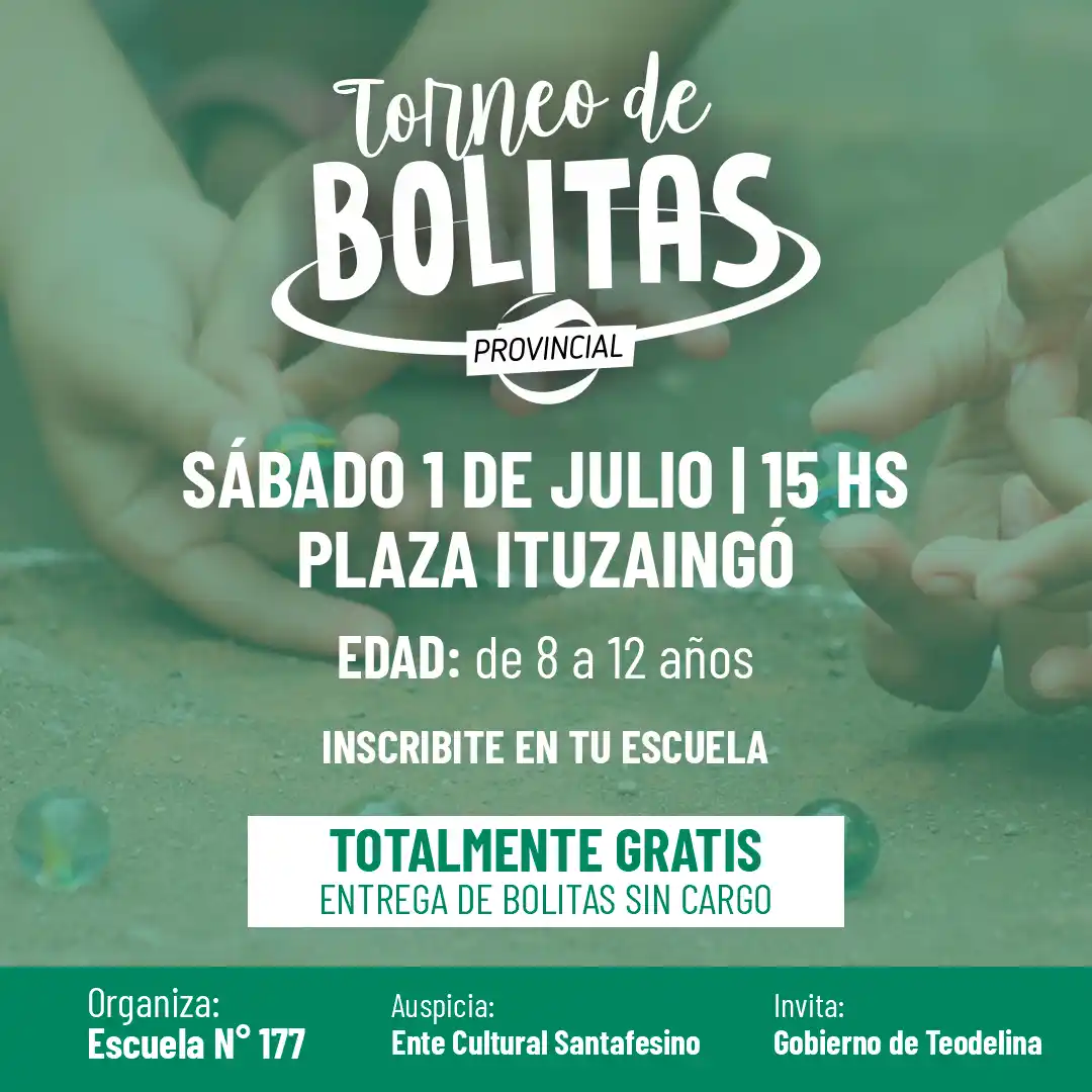 Desde la Escuela Fiscal 177 “Esteban Echeverría” se invita a las instituciones educativas a participar del “Torneo Provincial de Bolitas”, que –en su instancia local– contempla la participación de niños de entre 8 y 12 años, en partidos que se desarrollarán la Plaza Ituzaingó.