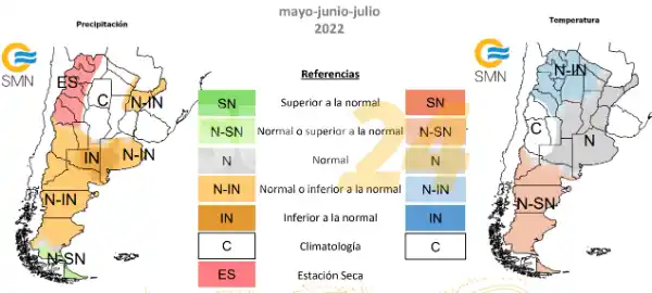 En cuanto a lluvias, el pronóstico trimestral del SMN indica que serían inferiores a la normal sobre La Pampa y oeste de Buenos Aires. Mientras estimó “normal o Inferior a la normal” sobre el norte del Litoral, este de Buenos Aires, Cuyo y el centro y norte de Patagonia. Precipitaciones normales o superiores se darían sobre el extremo sur de Patagonia. Mientras la región del NOA y norte de Cuyo transitarán la estación seca en el trimestre.