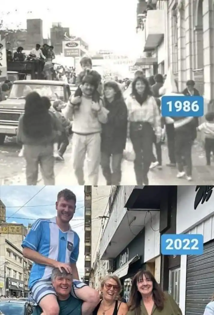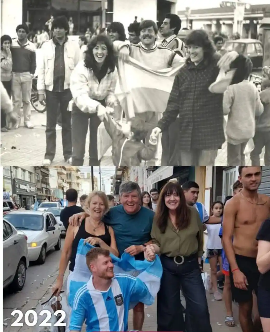 “Por cábala viajamos a Venado Tuerto, el lugar donde tomamos la foto original”, contó Patricia y detalló que hicieron el mismo recorrido para festejar. “La foto original la sacamos sobre la calle Belgrano, y la del domingo también. Caminamos por las mismas calles y veredas tirando papelitos que esta vez cortaron los más chicos de las familias”.