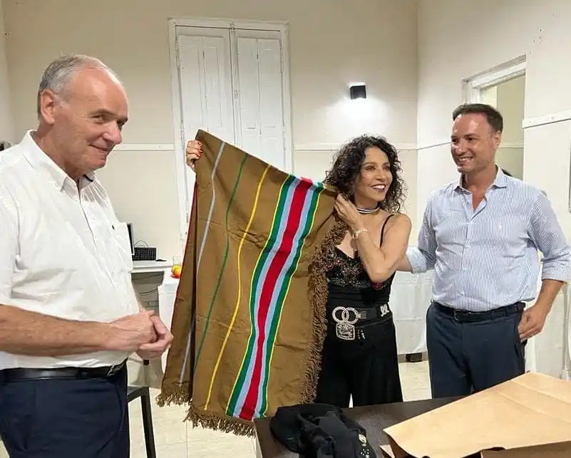 Por otra parte, el senador provincial Lisandro Enrico y el jefe comunal le obsequiaron a la cantante el poncho santafesino y el libro 31 “Historias de los pueblos y ciudades del departamento General López”.