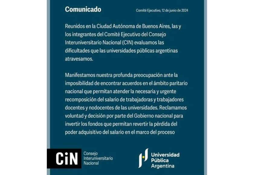 El Consejo Interuniversitario Nacional (CIN) manifestó su “profunda preocupación ante la imposibilidad de encontrar acuerdos en el ámbito paritario nacional que permitan atender la necesaria y urgente recomposición del salario de trabajadoras y trabajadores docentes y no docentes de las universidades”.
