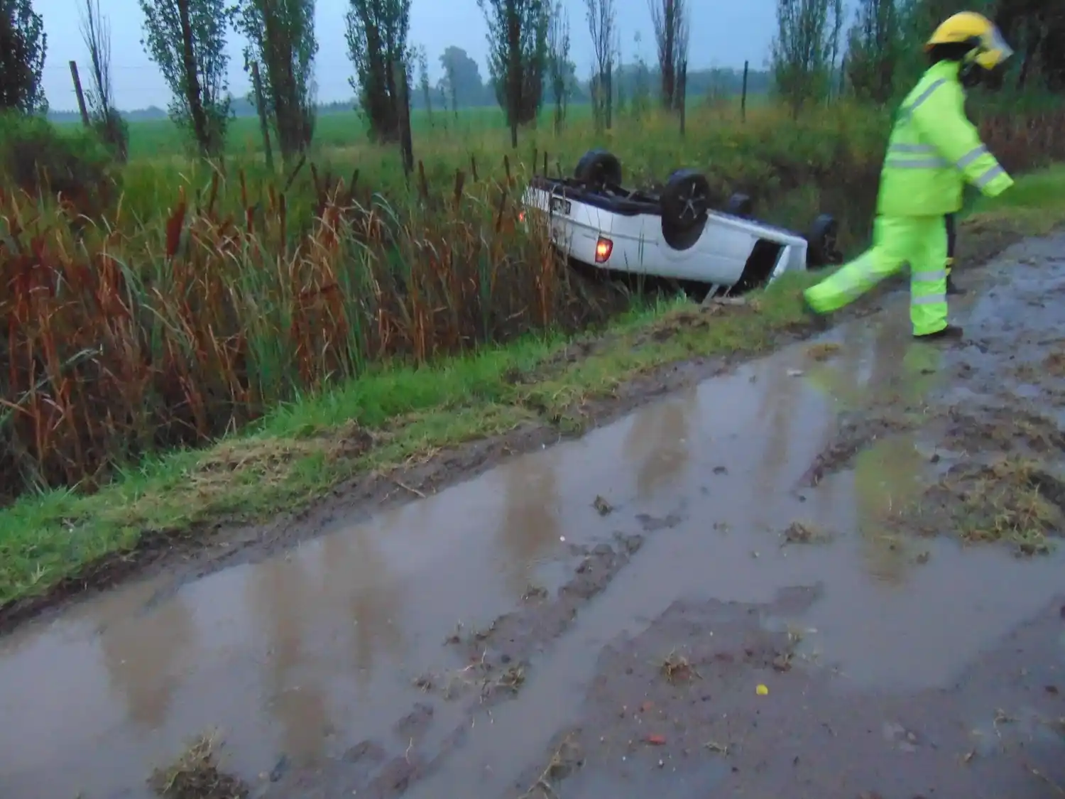 El conductor se encontraba en el interior de la misma y no podía salir por sus propios medios ya que no lograba abrir las puertas. Había agua en la cuneta que tapaba una parte de la camioneta.