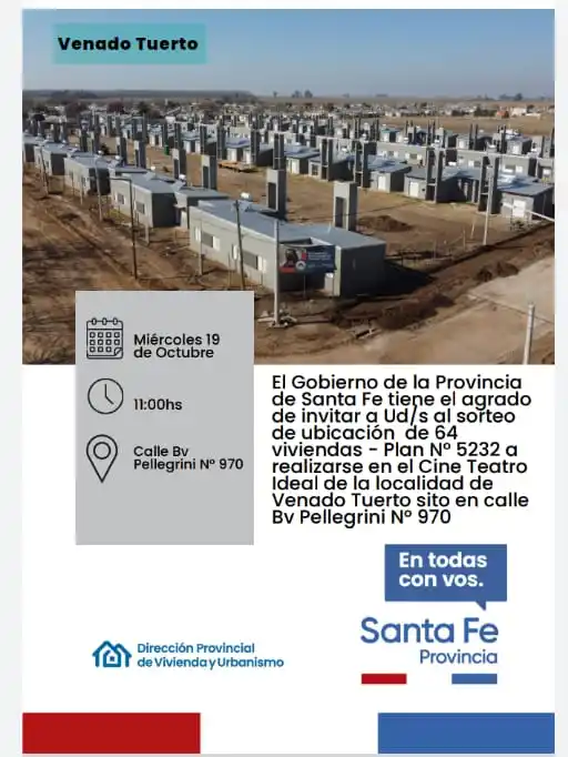 De este modo, el Gobierno dará un paso más en la adjudicación de las unidades construidas en el barrio Santa Fe de Venado Tuerto, dando a conocer la vivienda que le asignará a cada grupo familiar que salió sorteado en el mes de agosto.