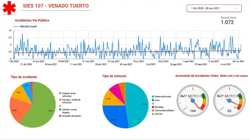 Datos de accidentes en la vía pública desde el 1 de diciembre del 2020 al 30 de noviembre del 2021. Fuente: SIES 107 Venado Tuerto.