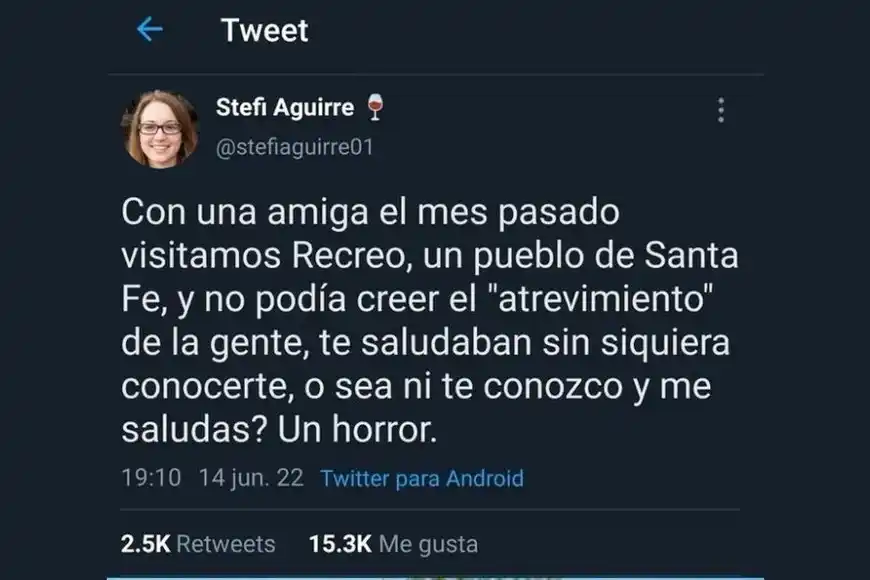 El polémico tweet expresa: “Con una amiga el mes pasado visitamos Recreo, un pueblo de Santa Fe, y no podía creer el ”atrevimiento” de la gente, te saludaban sin siquiera conocerte, o sea ni te conozco y me saludás? Un horror”.