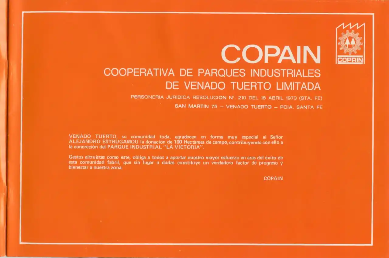 “Un grupo de industriales venadenses concibió en 1971 la posibilidad de formación de un Parque Industrial que, además de ordenar, crear, fomentar y desarrollar al sector específico, podría darle a nuestra ciudad una nueva fisonomía”. Son palabras fundacionales que constan en el acta de la Asamblea Constitutiva de la Cooperativa de Parques Industriales de Venado Tuerto Limitada, celebrada el 22 de enero de 1973.