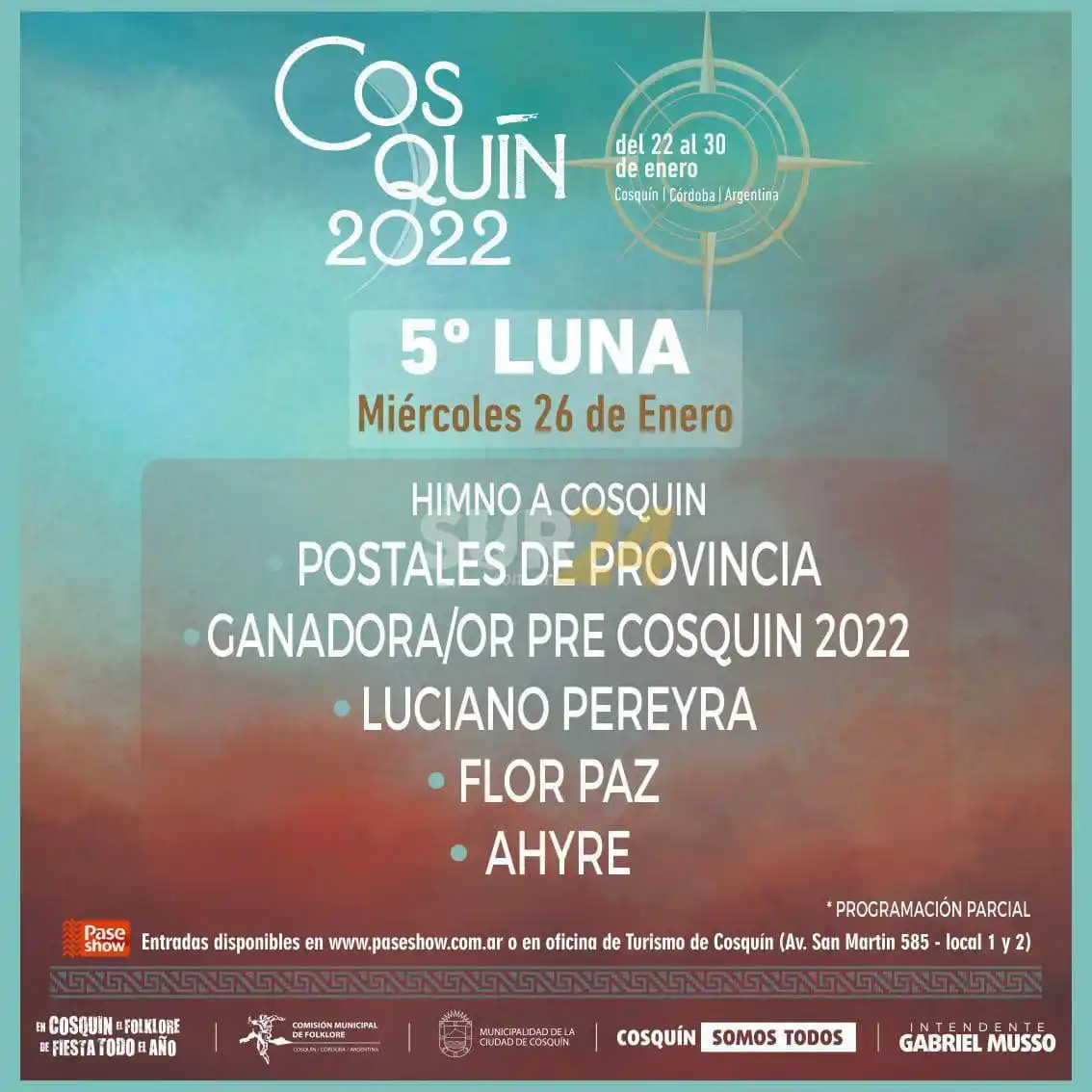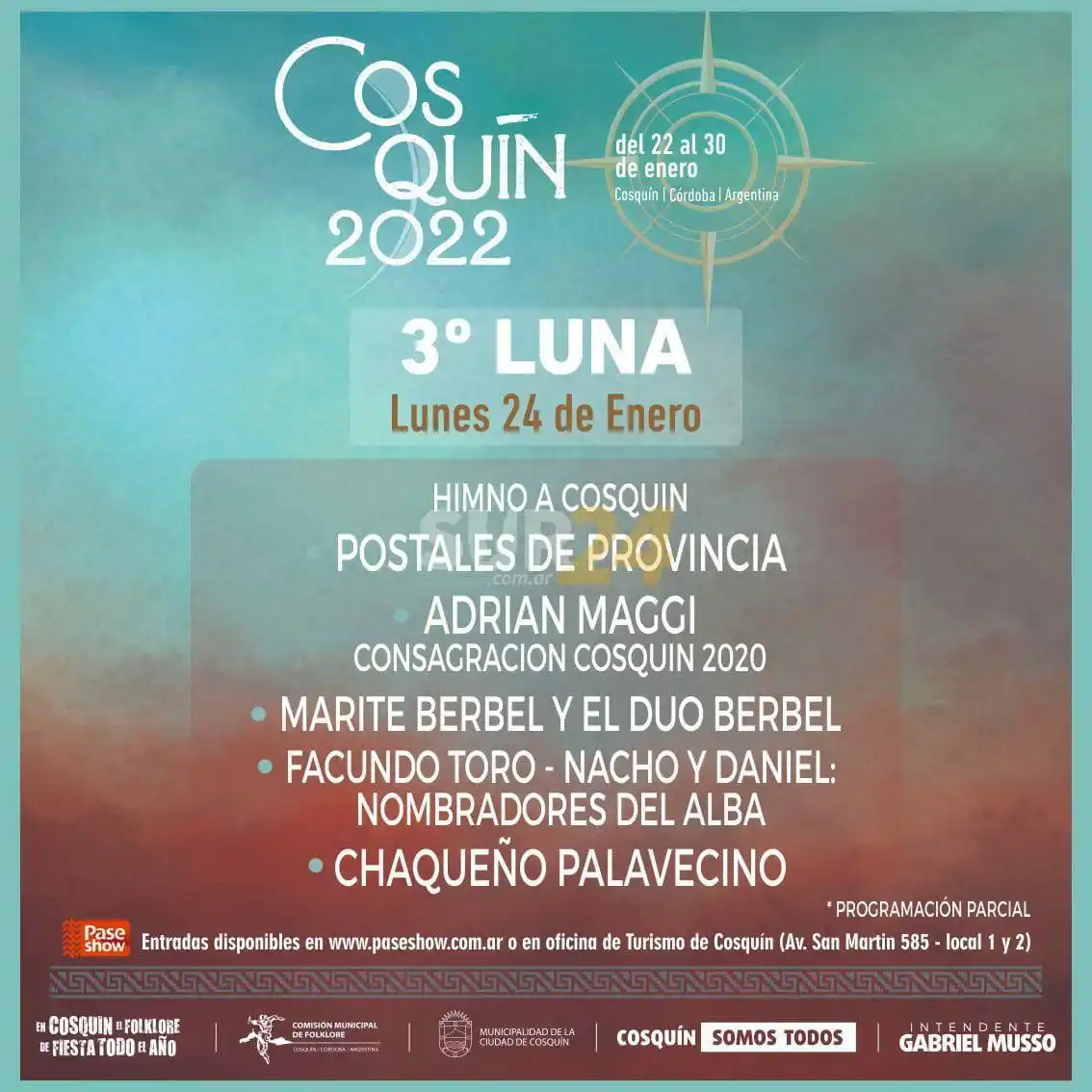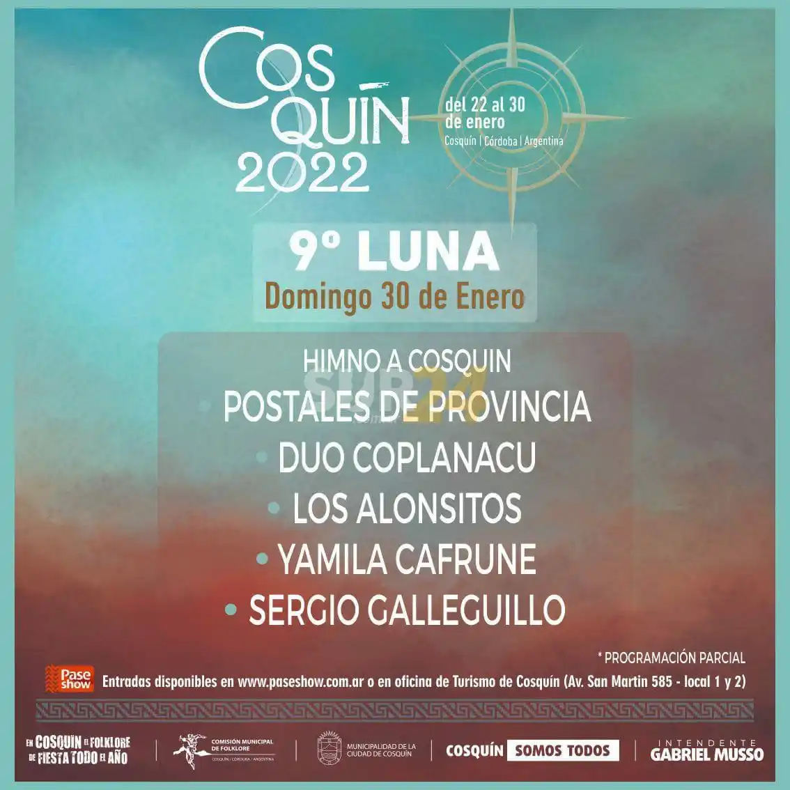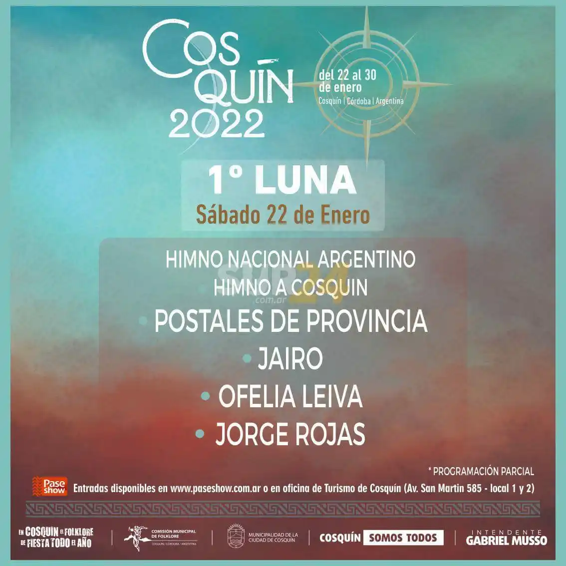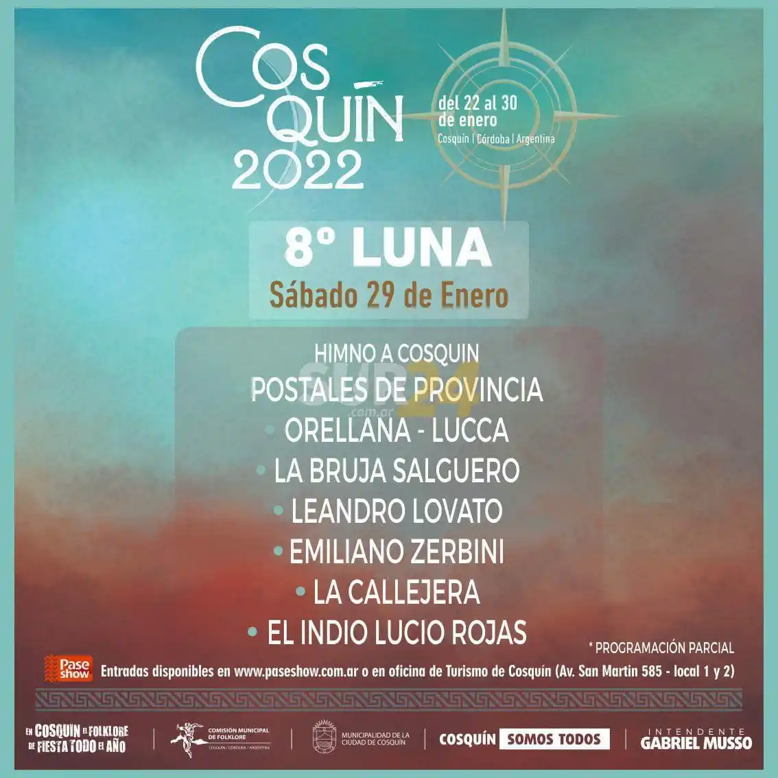El Festival de Folklore Cosquín 2022 de la localidad del valle de Punilla de Córdoba, se desarrollará entre el 22 y 30 de enero bajo el lema: “En Cosquín, el folclore de fiesta todo el año” y estos son los artistas confirmados a la fecha para las ya clásicas Nueve Lunas, en la Plaza Próspero Molina: