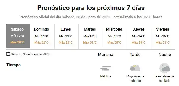 Si bien no se pronostican precipitaciones para sábado y domingo, el cielo estará parcialmente nublado por la tarde cuando la máxima toque los 28ºC y la noche seguirá con algunas nubes y traerán un domingo con cielo gris y pronóstico de chaparrones para noche. Siguiendo con el descenso en la temperatura la máxima se ubicará en 32ºC, no previendo un aumento por encima de esta marca para la semana próxima.